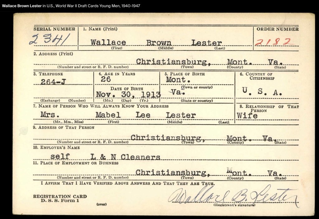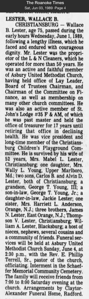 Alvin’s father, Wallace Brown Lester (1913–1989), married Mabel Lee Saunders on June 17, 1937, in Floyd County. The couple lived in Christiansburg, where Wallace owned L&N Cleaners. Alvin’s paternal grandparents were James Niles Wilson Lester (1880–1941) and Fannie Baker Thompson Lester (1886–1987). Fannie was the daughter of Herbert Thompson and Harriett Kincanon. James was the son of John C. Lester (1837–1924) and Annie Pate Lester (1843–1915), both born free in Lunenburg County, Virginia. John C.’s parents were Bolling Lester (1788–?) and Rebecca Barber (1790–1845).