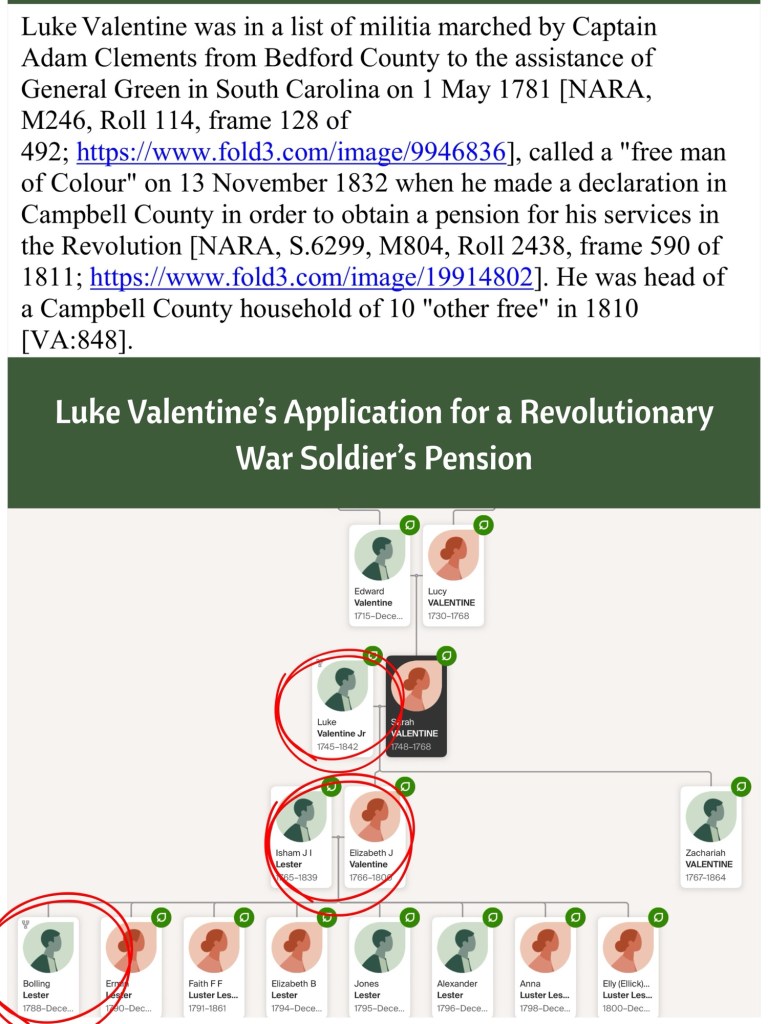 Luke Valentine, fifth-great grandfather of Alvin Lester’s, is one such example. He appears on a roster of men led by Captain Adam Clements of Bedford County, Virginia, who marched to South Carolina beginning May 1, 1781. This was a critical moment in the war, as Patriot forces sought to counter British advances in the South. Valentine’s inclusion on this roster places him among the free Black Virginians who answered the call to serve far from home in support of American independence.