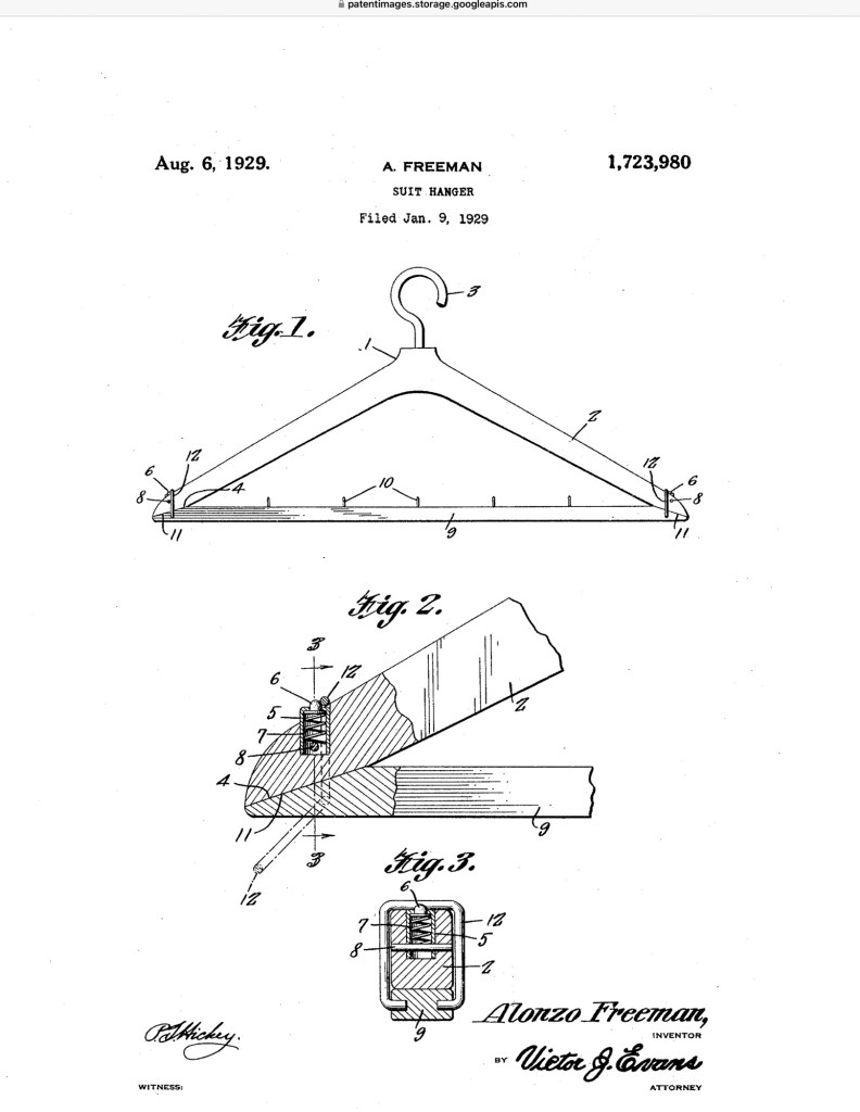 Working with coats, suits, and trousers, Freeman designed a better garment hanger. His invention included a removable bar for trousers and a simple latching mechanism that held the bar securely in place while still allowing it to be quickly removed.