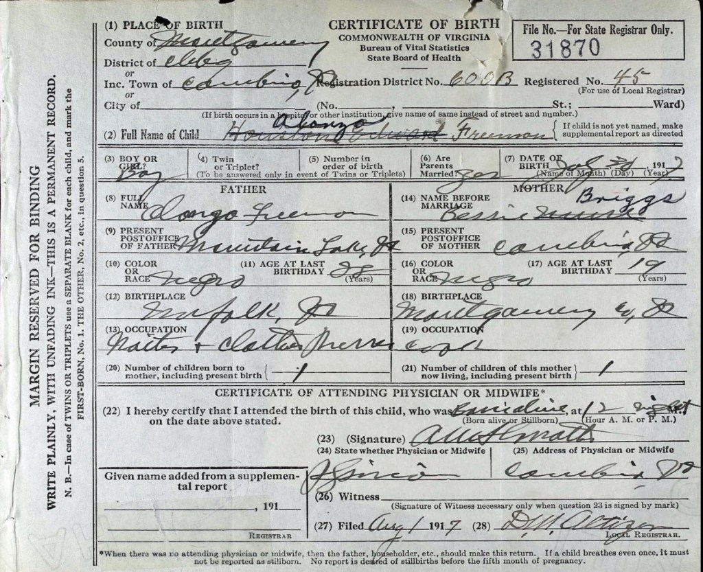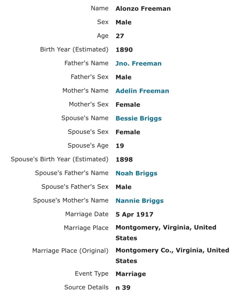 On April 5, 1917, Alonzo married Bessie Virginia Briggs (1899–1976) in Cambria, Virginia. Just a few months later, on July 31, 1917, their first son, Alonzo Freeman Jr., was born in Cambria, Virginia. According to his birth certificate, Alonzo Sr. worked as a waiter and clothes presser at Mountain Lake Resort, Virginia, while Bessie was a cook. During this time, they may have been living with Bessie’s mother and stepfather, who resided near the railroad tracks in Cambria.
