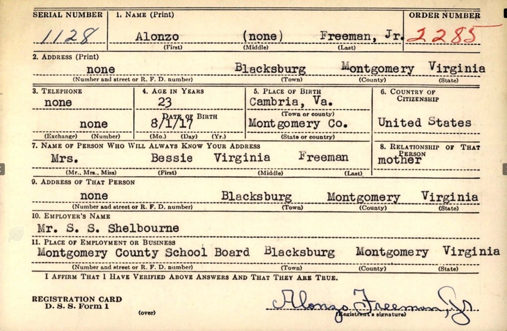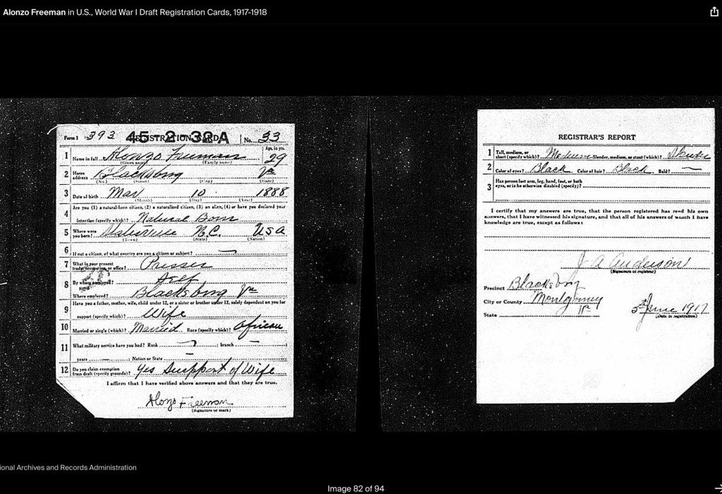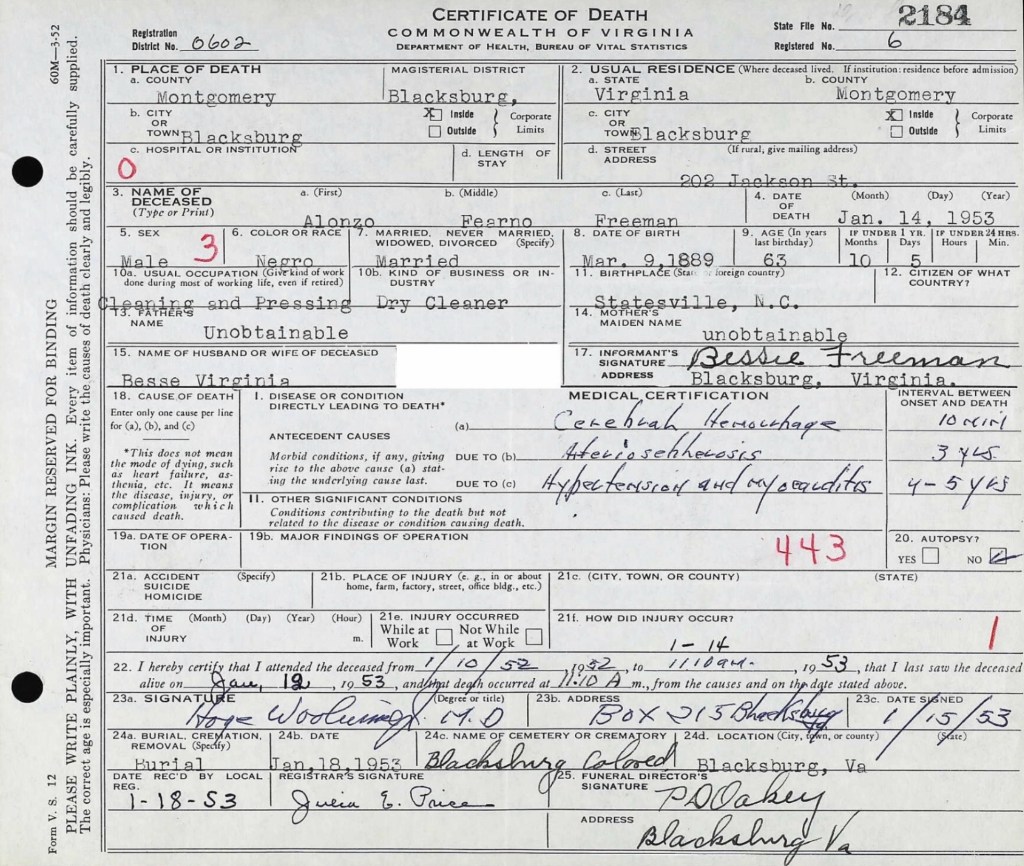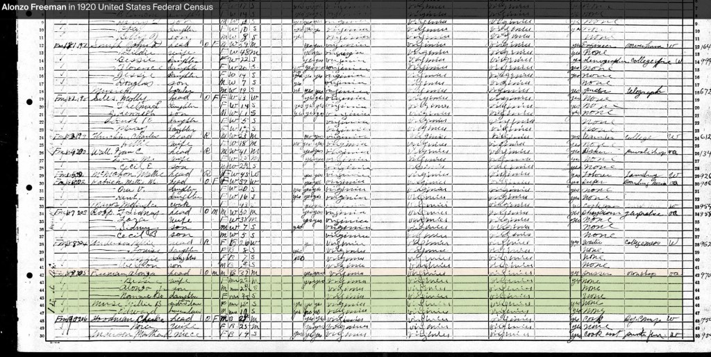 By the 1920 U.S. Census, the Freeman family had settled in Blacksburg, Virginia, on Jackson Street (originally Smithfield Road). Alonzo and Bessie were raising their two children, Alonzo Jr. and Nannie Bell (1919–1987). Also living in the household were Bessie’s siblings, Willie B. Muse and Edward Muse. At this point, Alonzo Sr. owned his home and operated his own pressing and cleaning shop. Their next-door neighbor was Nellie Anderson.