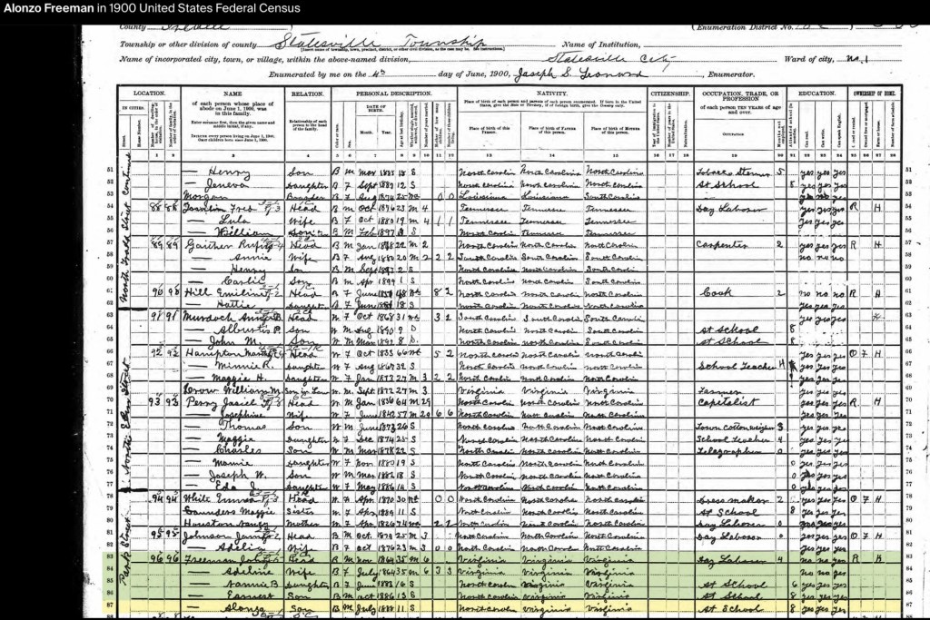 Alonzo Freeman in Statesville, NC in US Census 1900.