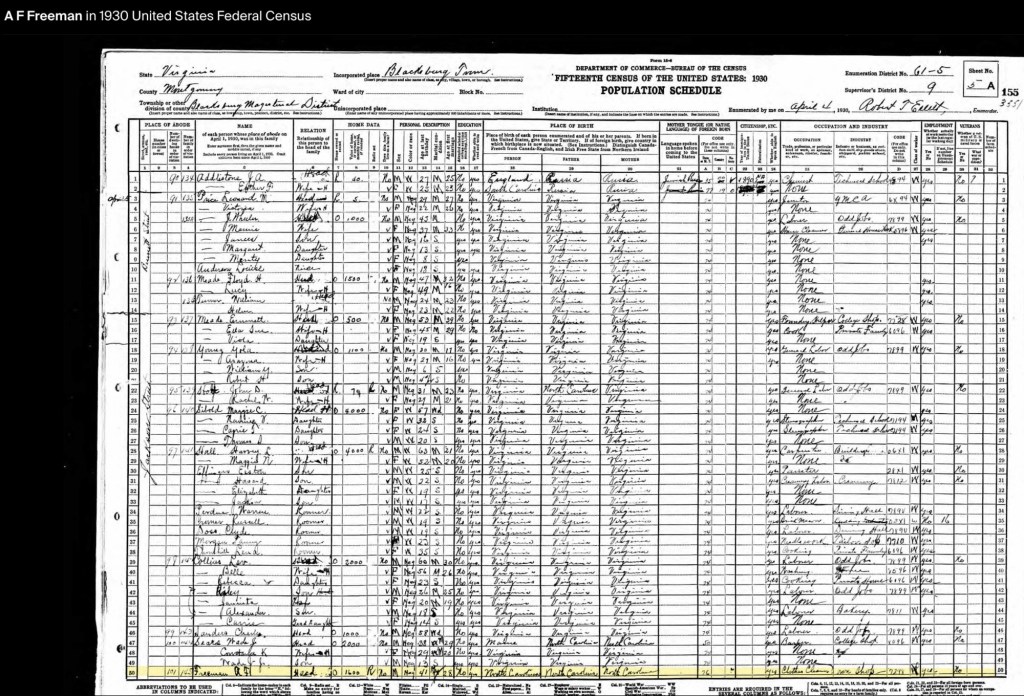 Freeman family in Blacksburg, Va on Jackson St (1st St) in US Census 1930