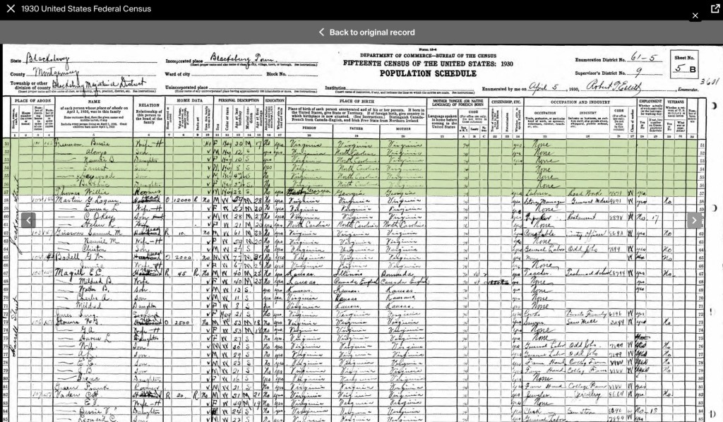 Freeman family in Blacksburg, Va on Jackson St (1st St) in US Census 1930. Willie Thomas included, boarder.