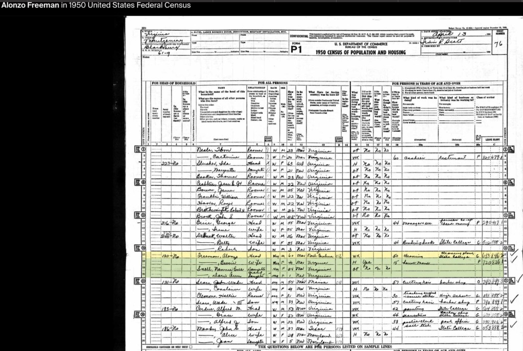 By the 1950 U.S. Census, Alonzo Sr., now in his 60s, was working at Virginia Polytechnic Institute’s Cleaning Plant. Nannie Bell and her daughter, Doris Ann, were living with her parents at the family home. By this time, all three Freeman sons had moved to Washington, D.C., with Linwood living alongside Haywood. Alonzo Jr. had married and was serving as the principal of the Clay Street segregated school before becoming the principal of an elementary school in Baltimore.