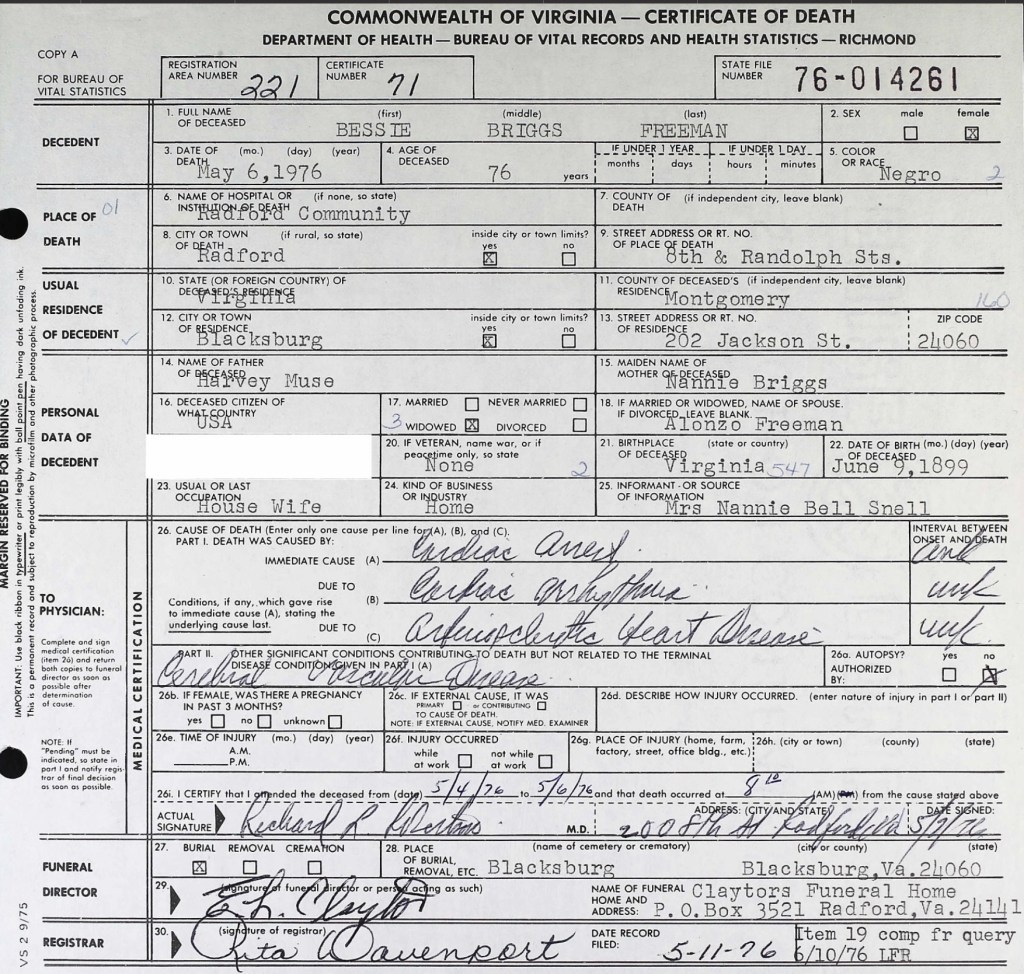Bessie’s mother, Nancy Sweeney, was born in 1872 in Christiansburg, Virginia. Her father, Noah Briggs, was the son of George and Jane Briggs. Nancy and Noah were married on February 14, 1894. By the 1900 Census, the Briggs, Green, and Sweeney families—several generations of the same extended family—were living as neighbors in Cambria.