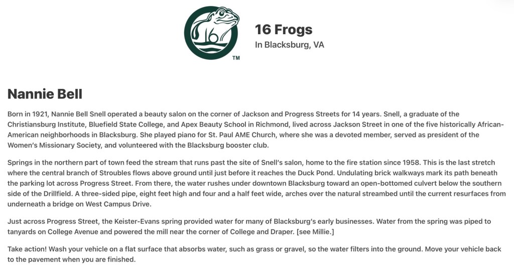 On November 19, 1947, Nannie Bell, now a beautician, married Sidney Grant Snell (1921–1975), a mechanic from Radford. The Snells raised six children and lived at 404 Jackson Street, just down the street from Nannie Bell’s parents, Alonzo and Bessie, who resided at 202 Jackson Street. Neither home remains standing today, but the Freeman residence was located at the same corner of Jackson and Progress Streets where the town’s 1958 firehouse now stands. Blacksburg named a frog to honor Nannie Bell.