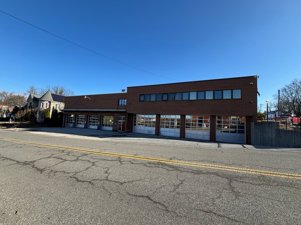 West-facing façade of Blacksburg Fire Station #1. The original 1957–58 building appears on the left side of the image, marked by the smaller doors. The Freeman family home once stood on the site where the newer vehicle bays are now located.