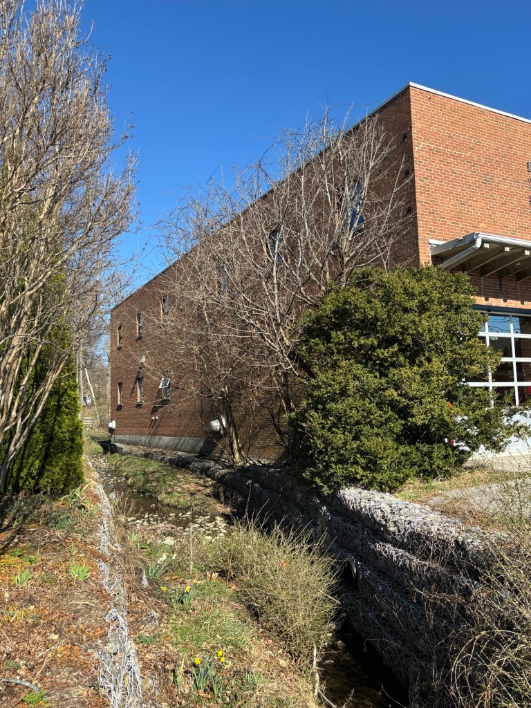 North-facing façade of Blacksburg Fire Station #1. The original 1957–58 building extended about halfway along the brick wall that runs parallel to Stroubles Creek, near the location of Nannie Bell’s frog.