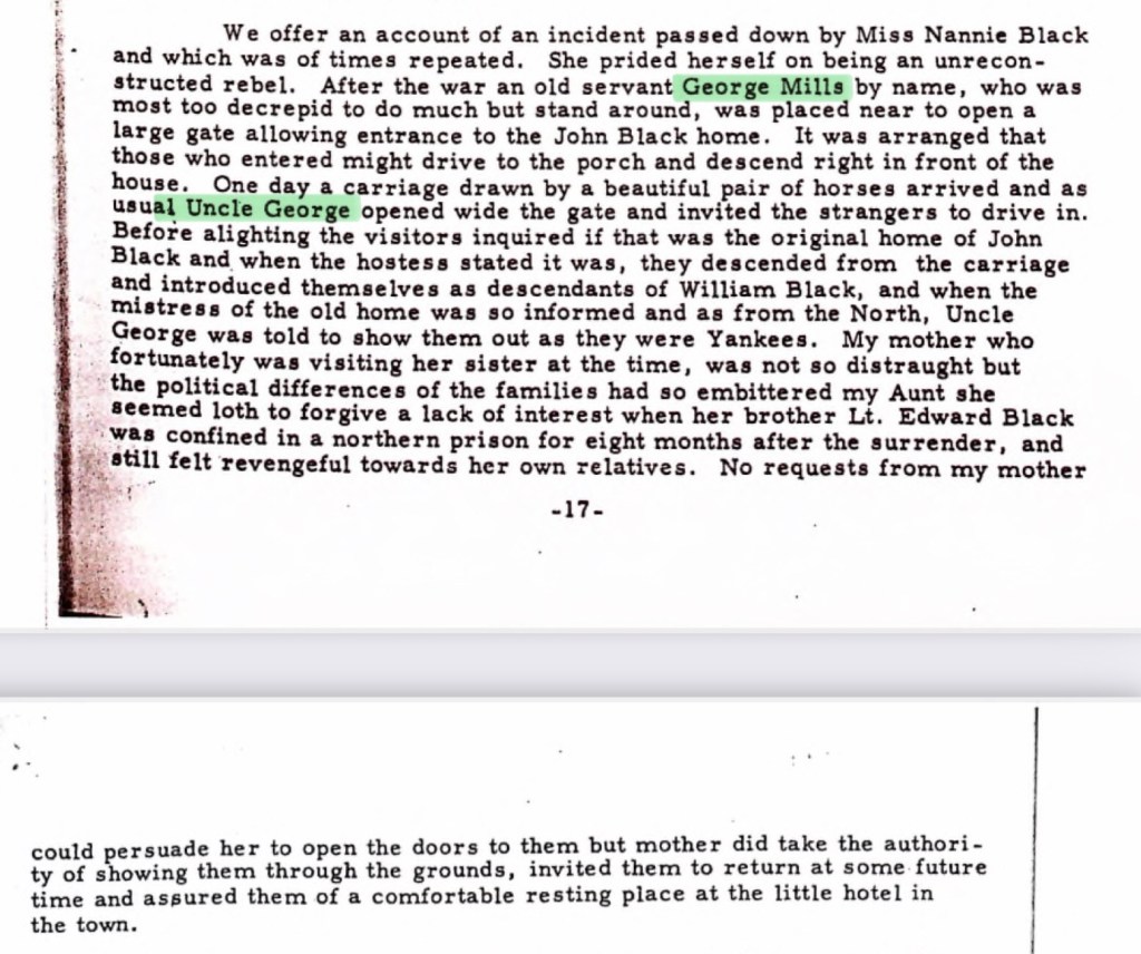 George Mills is noted as “After the war an old servant George Mills by name….” in Nannie Francisco Porter’s , daughter of Keziah Black Francisco.