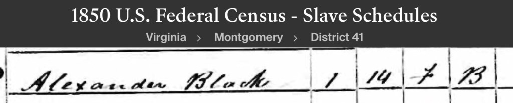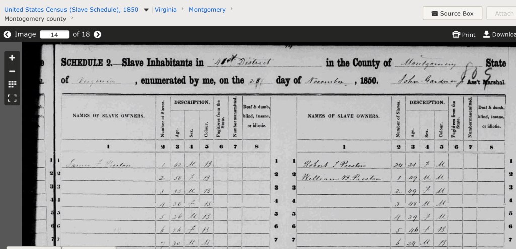 1850 US Federal Census, Slave Schedule for Montgomery County, VA
