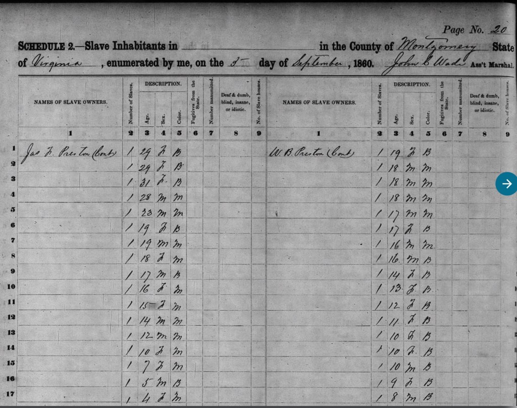 1860 US Federal Census, Slave Schedule for Montgomery County, VA